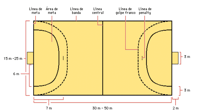 La pista suele ser de 40 m de largo y 20 m de ancho, con una portería en cada uno de los lados menores. Las dos porterías se ubican una frente a la otra, en los dos lados verticales del rectángulo (líneas de gol), y con cada uno de sus postes equidistante de los lados horizontales (líneas laterales) .